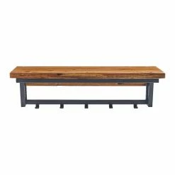 This collection of rustic wood and metal provides unpolished elegance to your space. We see this coat hook laden with your coats and scarves on its five hooks. Perhaps a small basket for mittens sits atop the shelf. Knots, cracks and even rough-hewn edges showcase the wood’s original qualities. Our lacquer finish with light and dark tones allows for the wood’s natural grain to show through. This collection will make a statement in your living space.