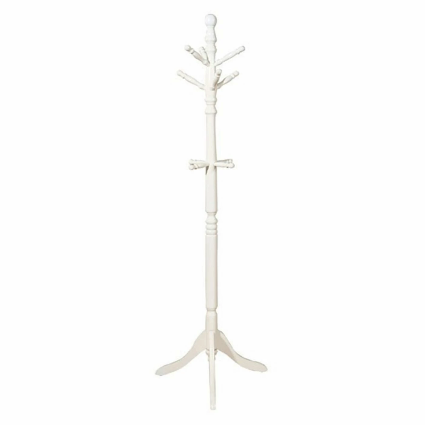 Welcome guests with the inviting Benzara Prismo Wood Standing Coat Rack in your entryway. This wood coat rack features turned details and a tripod of curved legs. Hang coats, jackets, and bags on the six larger pegs and add scarves and hats to the four small pegs.