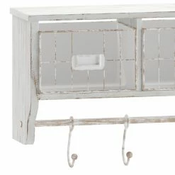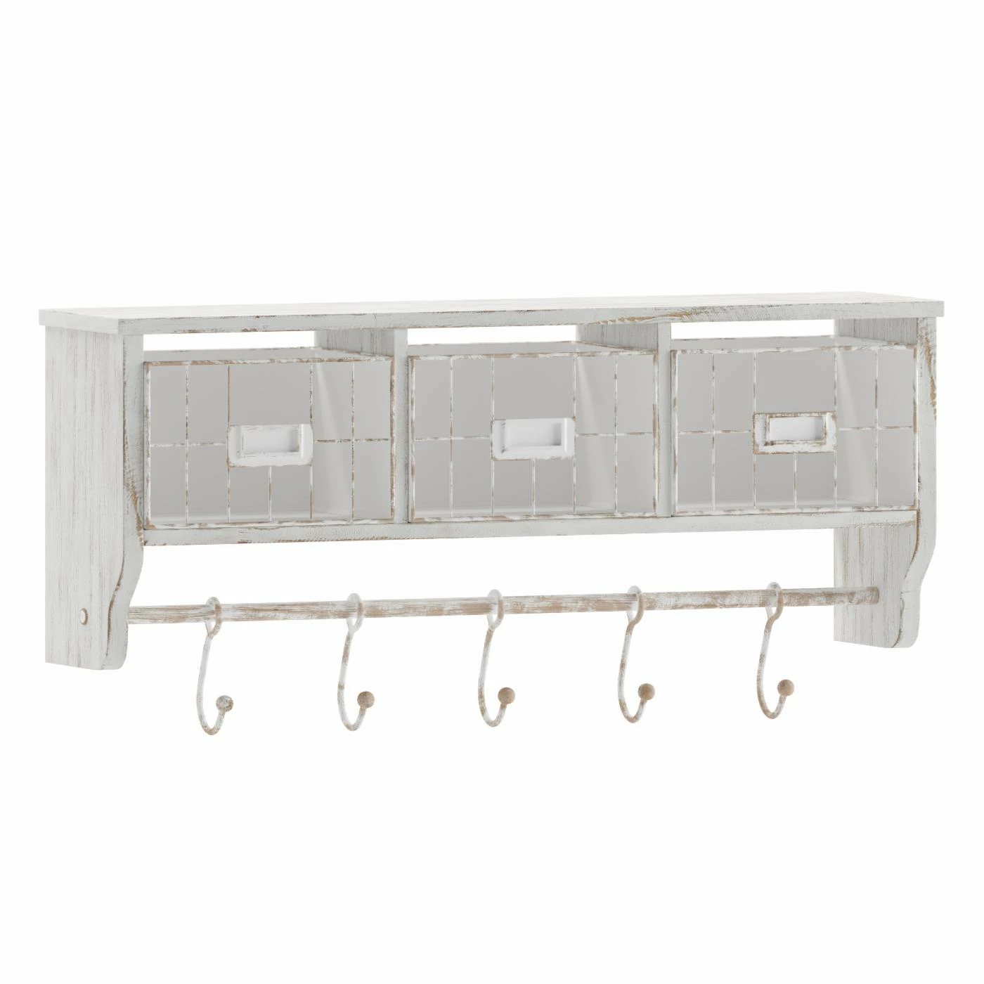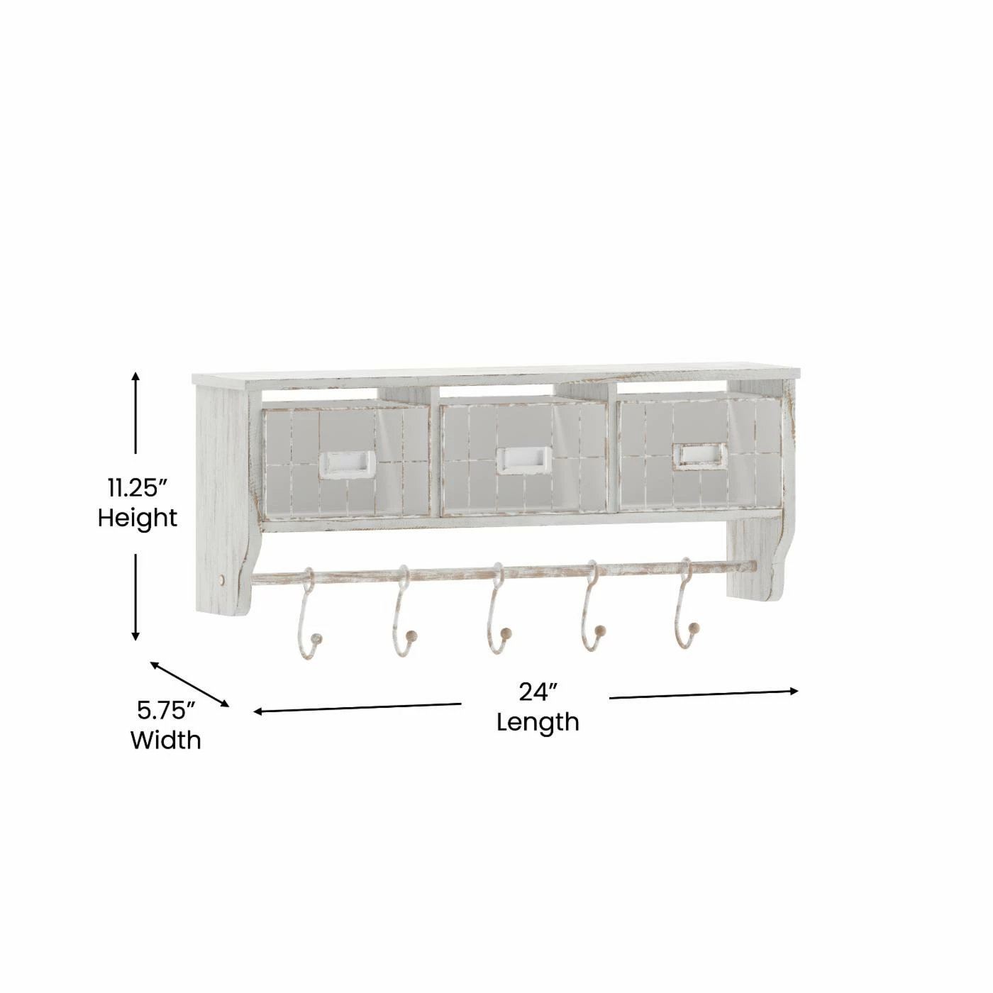 - Rustic 24″ wall mount storage shelf with wire baskets and hanging hooks