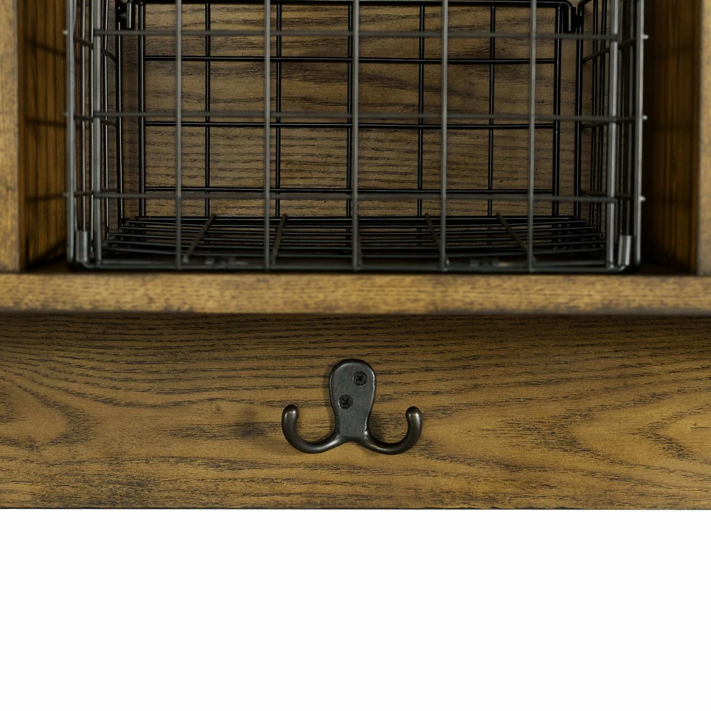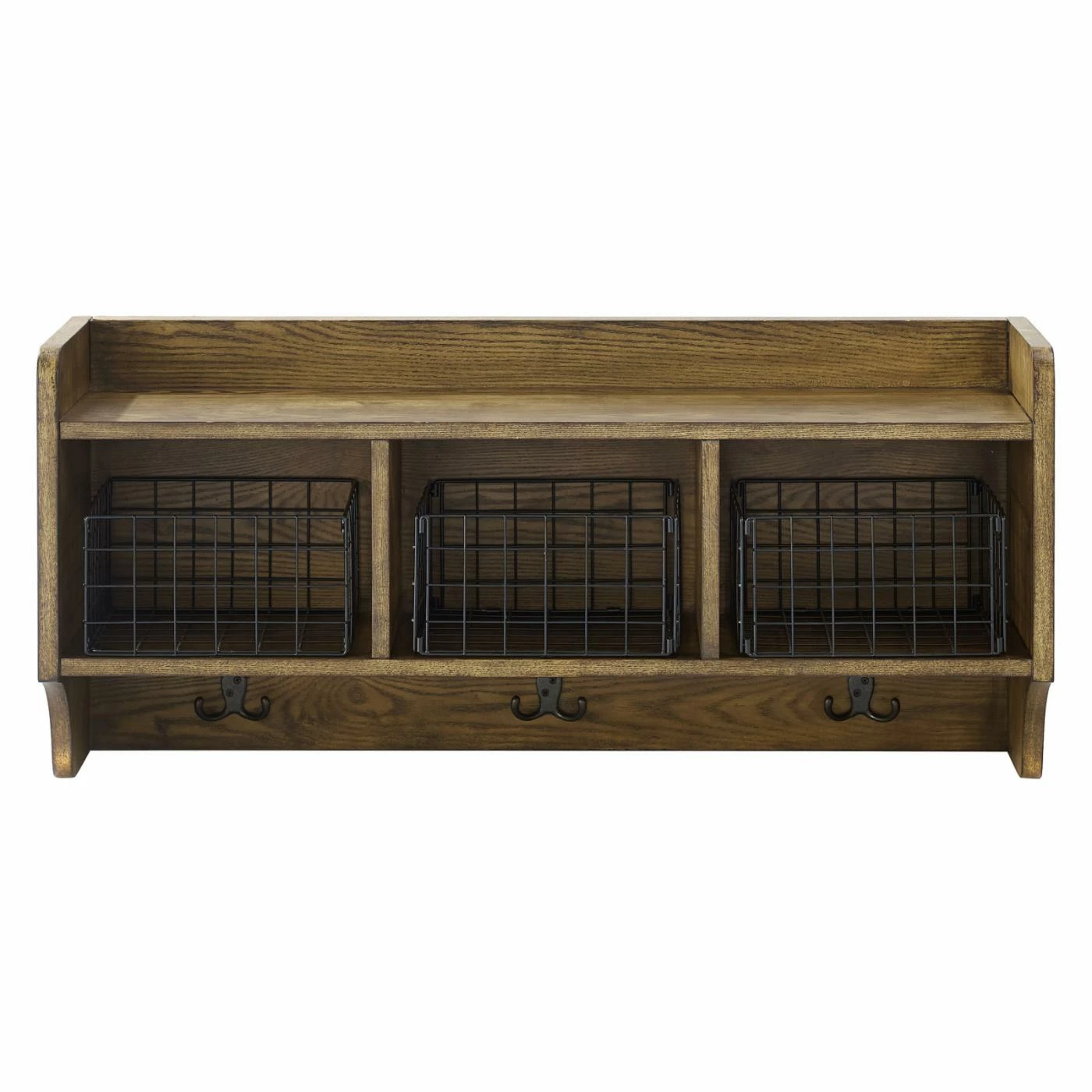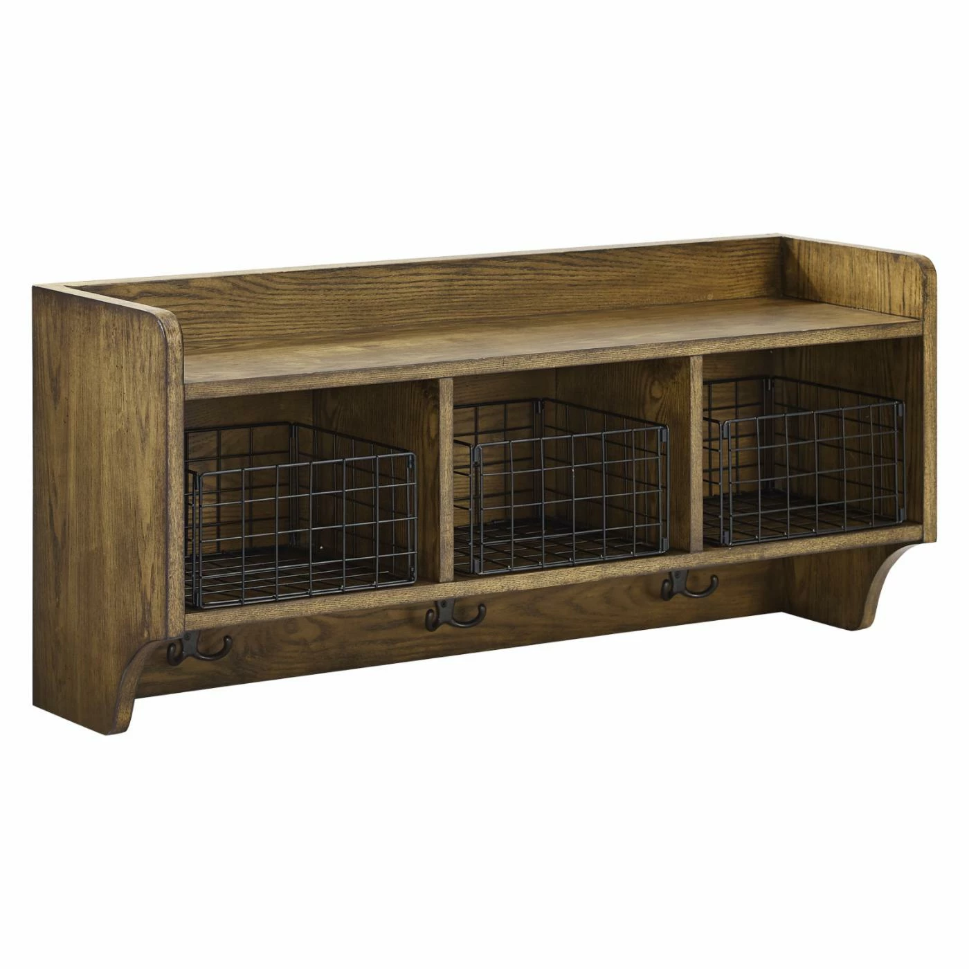 Install the Crosley Fremont Entryway Wall Shelf in your entryway for convenient storage. This rustic shelf is crafted from strong engineered wood and features coffee veneers with an eye-catching wood grain. Three hooks give you space to hang your hats and coats, and three cubby holes feature galvanized wire baskets inside to help items stay secure. It comes with hardware to make it simple to mount.