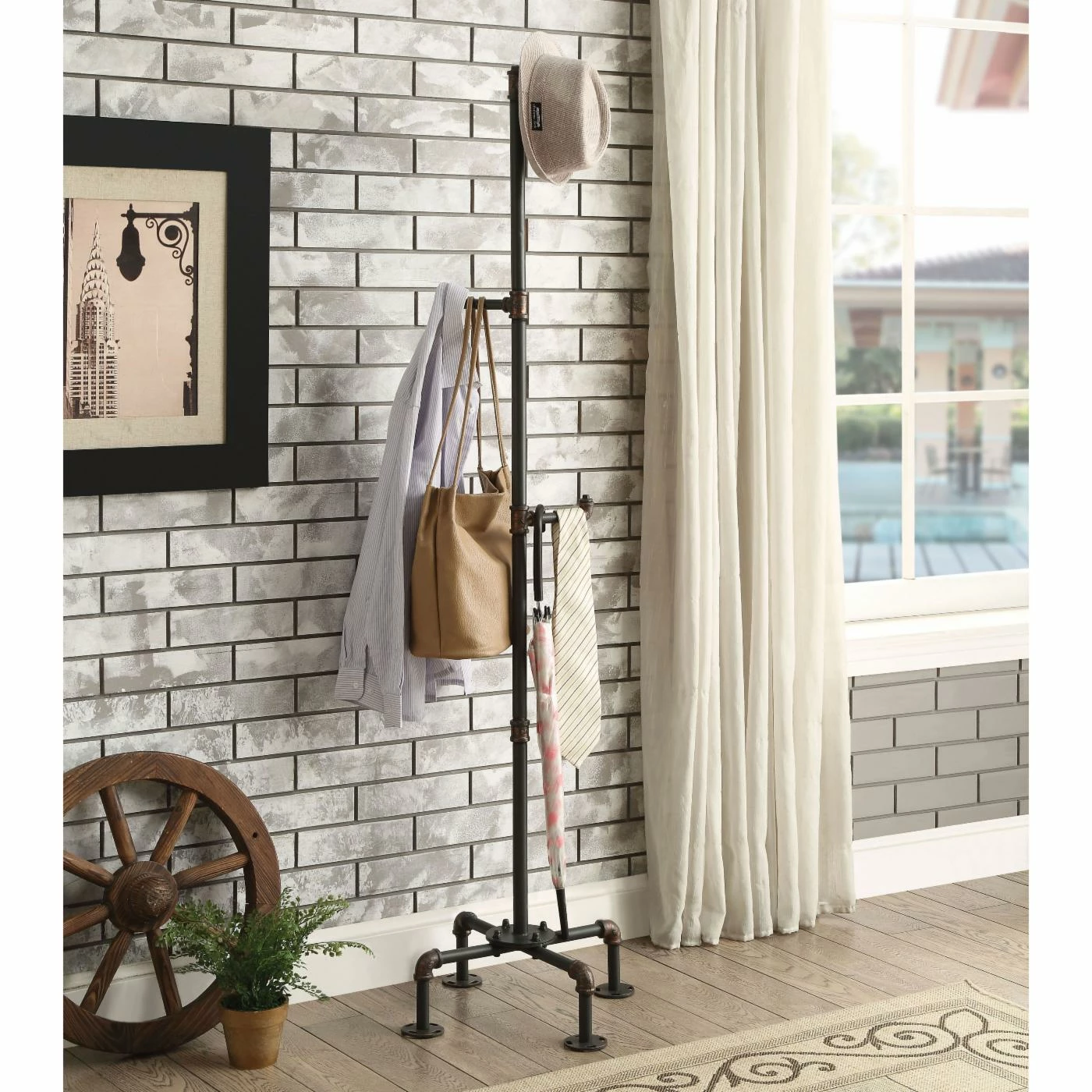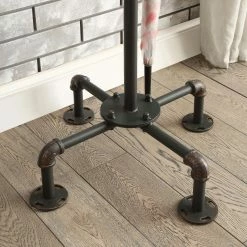 Store heavy coats or favorite hats on the Furniture of America Akayla Industrial Style Coat Rack with a sturdy metal frame. This coat rack features rounded, flat feet for added sturdiness and pipe-inspired accenting that adds urban-edge to your living space. The dual finish of black and copper enhances the overall industrial vibe of this industrial-chic coat rack.