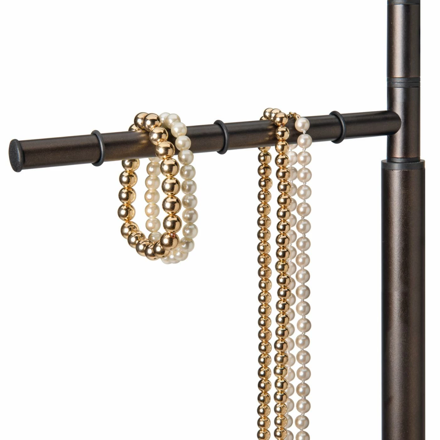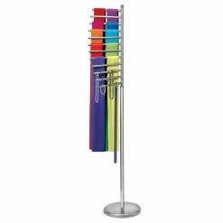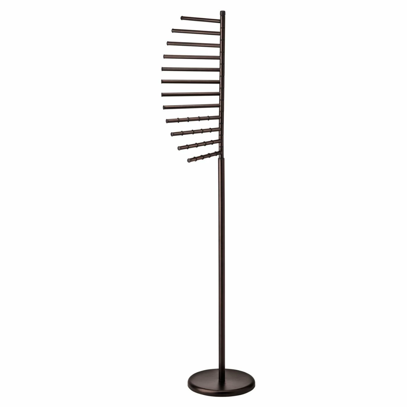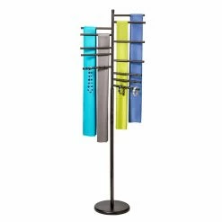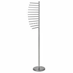 The Lynk Floor Standing Pivoting Accessory Organizer Rack is an elegant and feature-rich storage solution for any fashionista. No more wrinkly scarves, tangled jewelry, or misplaced belts. The hanger features bars wide enough for scarves, but also perfect for smaller items such as bracelets. You can organize your accessories with removable rings, keeping everything right where you need it when you need it. Need to reach for something that’s in the back? That won’t be a problem as the hanger easily pivots 360 degrees. If you have a lot of accessories, there’s no need to worry as the sturdy epoxy-coated steel and weighted base ensure worry-free use for years to come. The hanger comes in your choice of finishes.