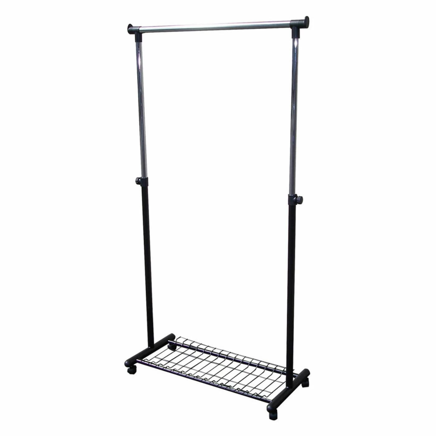 Add a little functional style to your living space with the Ore International 62 in. Mobile Coat Hanger. This contemporary metal and plastic coat rack features wheels for easy mobility between rooms and a single, adjustable-height hanging bar fit to accommodate everything from cropped jackets to trench coats, up to 35 lbs. A black wire shelf is the perfect landing place for shoes or work boots, and hooded plastic caps extend hanging space a few inches beyond the scope of the bar. This easy-to-assemble coat rack comes in a black and chrome finish sure to suit any decor for a look that is both flattering and functional — in the entryway, the closet, or anywhere in between.
