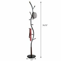 The contemporary design of the Roundhill Furniture Arles Metal Standing Coat Rack adds style to your space while giving you a place to hang coats, hats, umbrella, or scarves. This sturdy metal coat rack has a modernized tree design, with branches that have wooden ends to hold your outerwear in varying lengths and height. The black and walnut finish complements any dΓ©cor. A heavy round base provides stability to keep it from tipping. Quick and easy assembly.