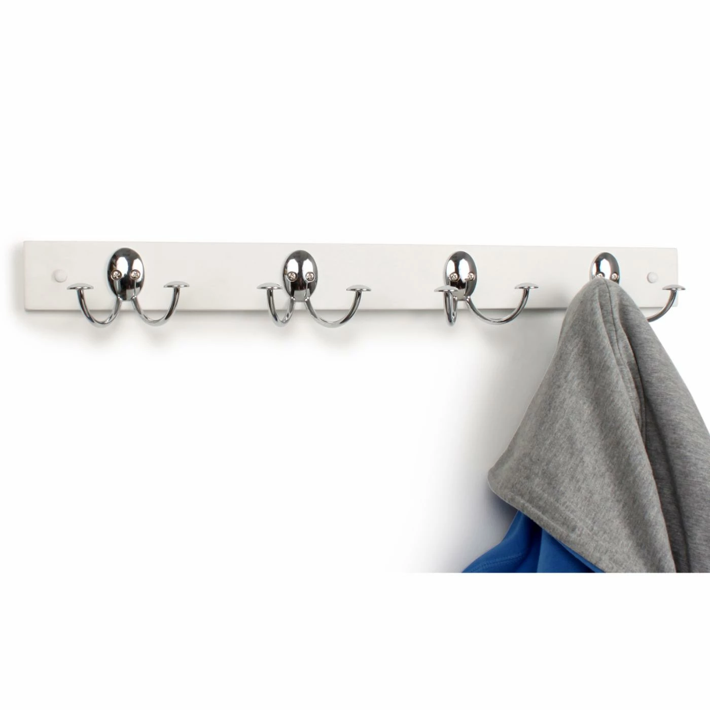 Polished steel hooks add contemporary shine to the rustic wood panel base of the Spectrum Diversified Stratford Wall Mount 4-Double Hook Rack. This wall-mounted rackβs four double hooks are ideal for coats and other clothing or accessories, whether you install it in a laundry room or add extra hanging space in a closet or hallway.