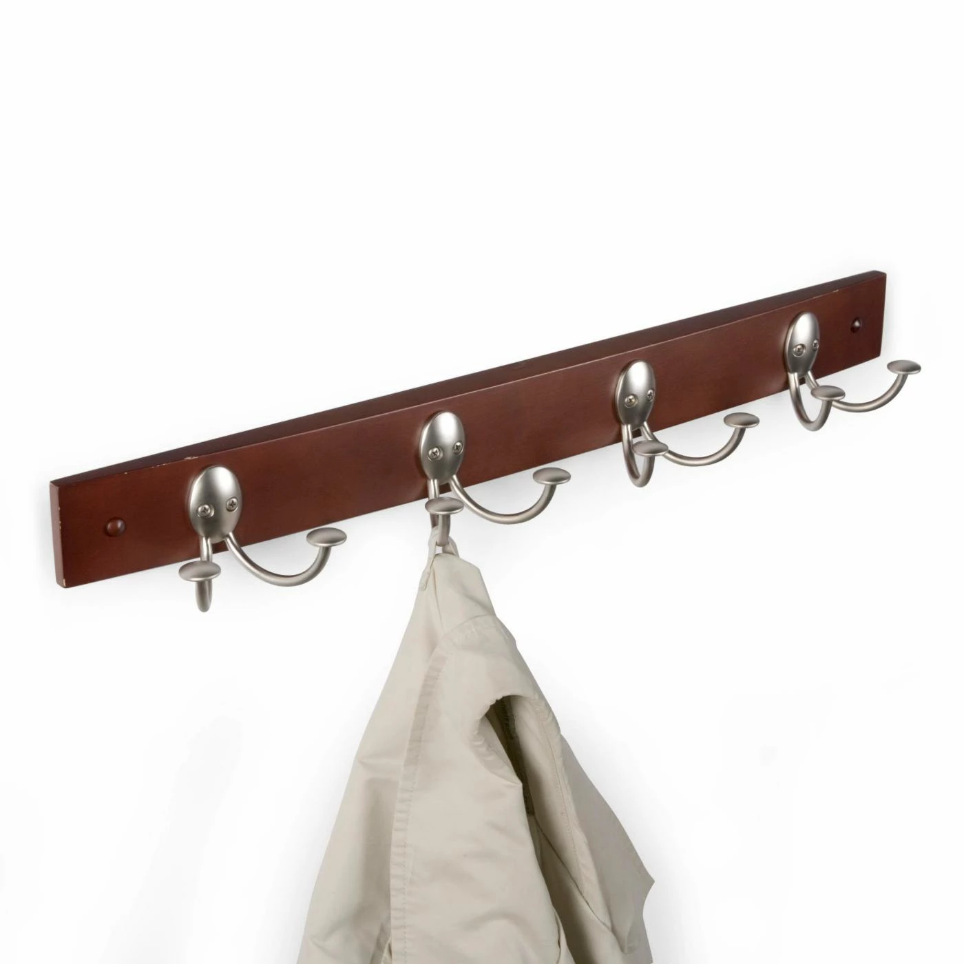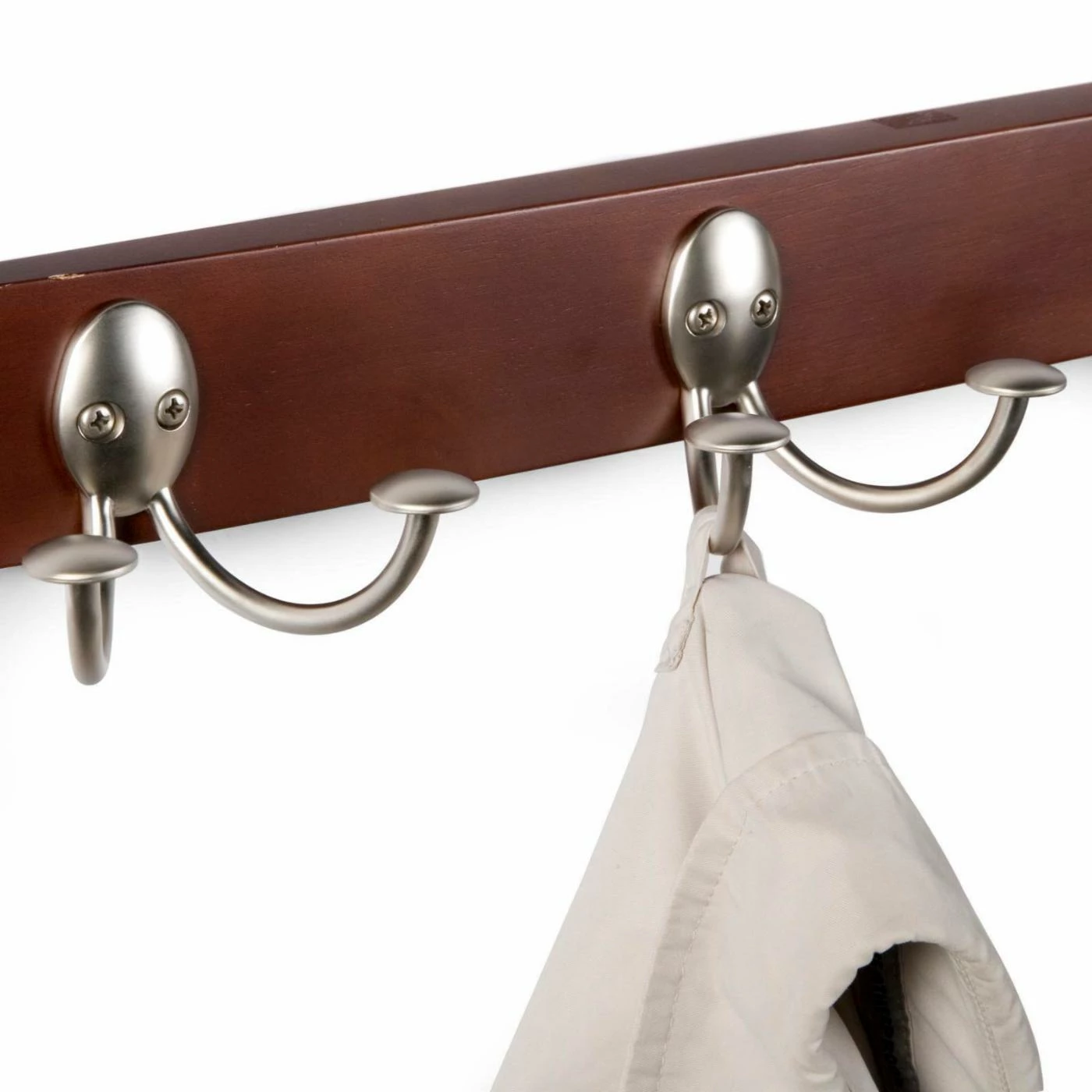 With four double hooks for double the hanging space, the Stratford 4 Double Hook Walnut Coat Rack is a favorite hangout for all your coats. Deep curls in the hooks prevent items from slipping off, while the dark walnut-finished wood and satin nickel-finished hooks create modern appeal. This wall-mounted coat rack comes with all the hardware you’ll need, including matching plugs that cover the mounting screws.