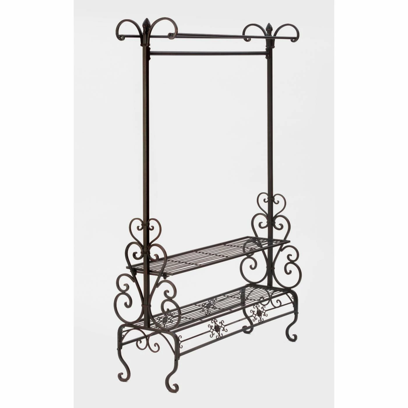 Showcase your favorite hanging items in sophisticated style with the Tripar Metal Garment Floor Rack. This freestanding garment rack is made of dark brown metal in a traditional style with elegant scrolled detailing. One hanging rod and two shelves make the perfect display space for scarves, shoes, purses, and more.