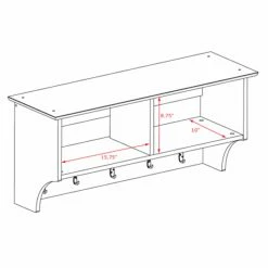 No entry closet? Keep it together with the 36 in. Wide Hanging Entryway Shelf. It’s ideal for a child’s room, entryway, kitchen, mudroom, or home office as a way to keep gear organized and your space looking its best. Hats and gloves can live in baskets on the two shelves, or use the shelf space for frequently toted books or other essentials. There are three large hooks for coats, jackets, and sweaters and two accessory hooks for scarves, bags, hats, and the like. A strong, secure hanging rail system is also very simple to install with included hardware and directions. Choose a finish that suits your space for this item. Each of the two cubby spaces measures 15.75W x 8.75H x 10D in. Made in North America of CARB-compliant laminated composite wood.