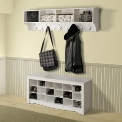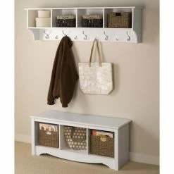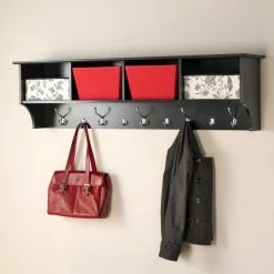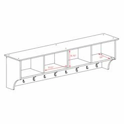 Capricious climate? The 60 in. Wide Hanging Entryway Shelf can stow your gear in style so you can easily locate what you need for any type of weather. Use it in your entry hall, kitchen, mudroom, or children’s room for an organizational boost. Four compartments provide space for each family member to store baskets, gloves, hats, important folders, and more. Each compartment measures 13.5W x 8.75H x 10D in. Five large hooks accomodate outerwear while four small hooks can hold bags, purses, scarves, and little people’s coats and hoodies. Installation is a snap with the innovative and strong hanging rail system. Hardware and instructions are included. Made in North America.