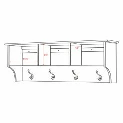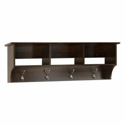 Enter, style and versatility. The Fremont Entryway Shelf offers practical, everyday storage and a simple yet sophisticated look. Made of highly durable, laminated wood composite, this entryway shelf comes in an inviting espresso finish to complement your decor. Perfect for any front hallway, bedroom, or home office, this entryway shelf offers three open compartments for convenient and attractive storage. Four large metal hooks accommodate coats, jackets, scarves, hats, and bags. Assembly is easy with the two-piece hanging rail system. Dimensions: 48W x 11.5D x 16.5H inches. For a coordinated look, add the matching Fremont Cubbie Bench (not included).