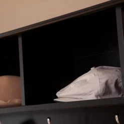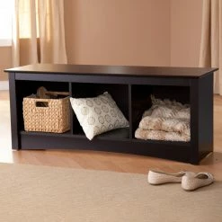 Crisp edges and a sleek black finish give this coat rack and bench set a modern elegance. The Prepac Sonoma Black Triple Cubby BenchΒ & Coat Rack Set, is a practical, convenient, and handsome addition to your home. Both pieces are constructed of high-quality, durable, easy-to-clean, laminated wood composites. The coat rack features three cubby storage compartments and four large metal double hooks. The bench offers additional seating and three more storage compartments. Although this set does not come with storage baskets, you can purchase baskets and tuck them neatly into the cubbies for tidy storage of scarves, shoes, toys, and more.